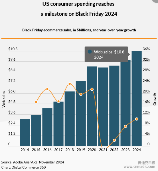根據(jù)Adobe的數(shù)據(jù),2024年黑色星期五的電商銷售額首次突破100億美元大關(guān),達(dá)到了108億美元。