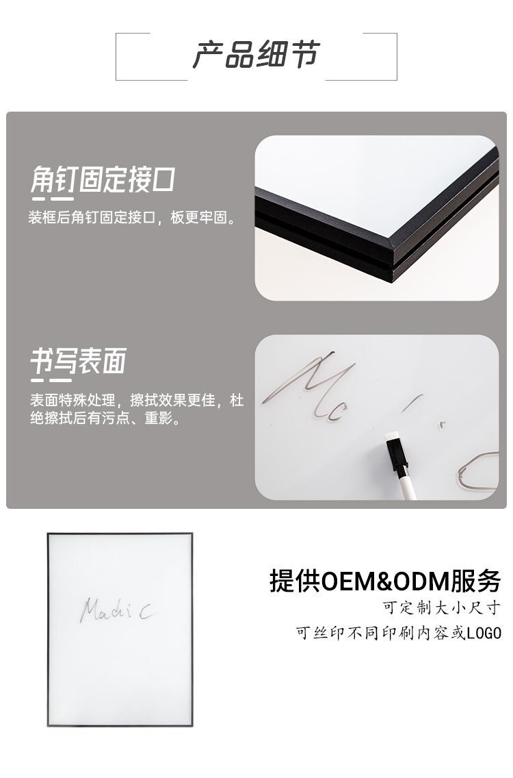 玻璃白板是一種高端辦公用品,具有鋁合金邊框和鋼化玻璃材質(zhì)。其磁吸面板設(shè)計(jì)能夠方便用戶固定文件和便簽,使辦公更加整潔高效。這款45x60厘米的玻璃白板不僅尺寸適中,而且可以根據(jù)客戶需求進(jìn)行定制,滿足不同辦公環(huán)境的需求。無論是用于會(huì)議討論、寫作記錄還是創(chuàng)意涂鴉,玻璃白板都能為用戶提供優(yōu)質(zhì)的書寫和展示體驗(yàn)。