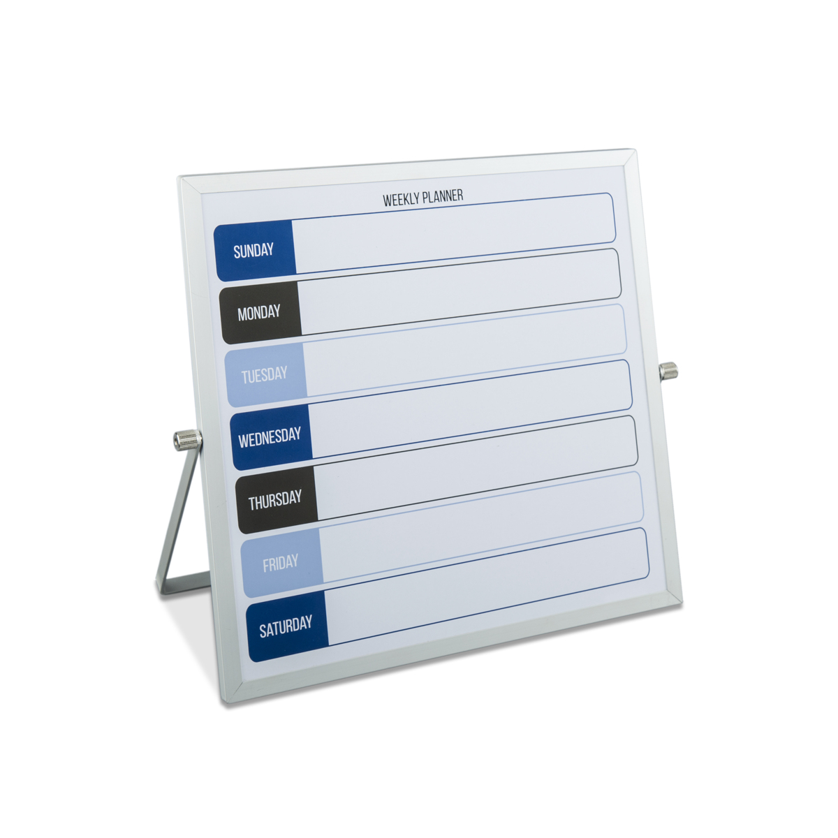 這款桌面支架小白板,主要有8*12、10*10、12*16英寸(20*30、25*25、30*40厘米)幾種尺寸,鋁合金外框,一面印有月歷,另一面是純白板;雙面可以書寫,定制款可以印刷內(nèi)容,主要用于日程安排、記事備忘等,適合辦公、家庭使用;